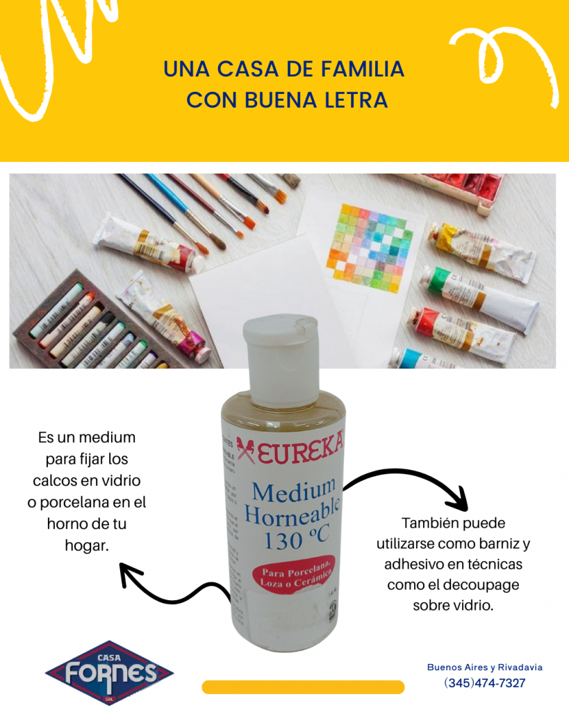 • Medium Horneable 130°C: para fijar calcos en vidrio o porcelana, también usable como barniz y adhesivo.
