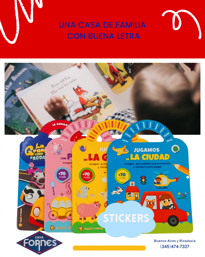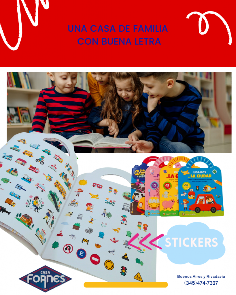 Libros temáticos con más de 70 stickers cada uno, ideales para jugar, pegar y aprender sobre la ciudad, la granja, el parque y mucho más.